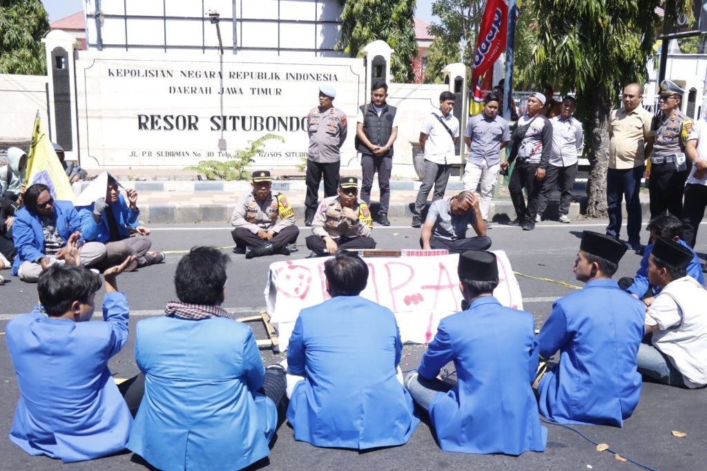 Kapolres Situbondo AKBP Dwi Sumrahadi Rakhmanto yang menemui peserta aksi tersebut juga mengikuti pembacaan doa dan tahlil bersama – sama para Mahasiswa.